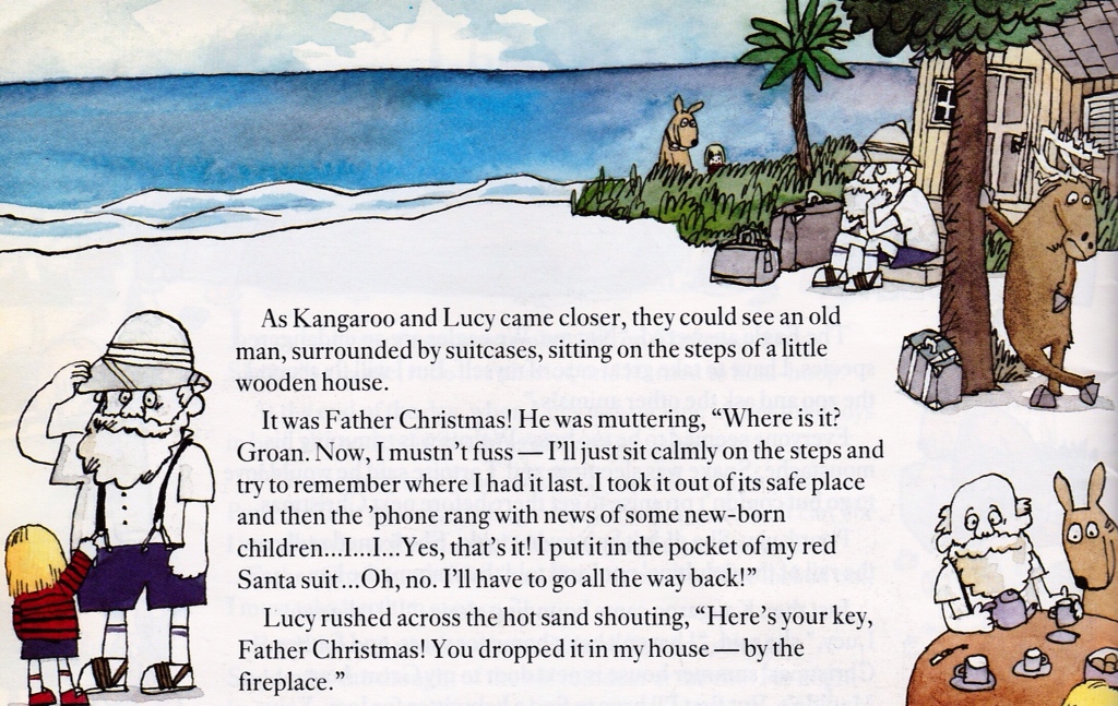 Lucy travels to the zoo to ask for directions from the reindeer, who is unfortunately too tired to guide her there. So she jumps in the pouch of a kangaroo and together they travel by dolphin to F.C's seaside cottage. And there waiting on the doorstep is a forlorn Santa, who has at least remembered his seaside wardrobe of pith helmet, shorts, braces, sandals and socks.
