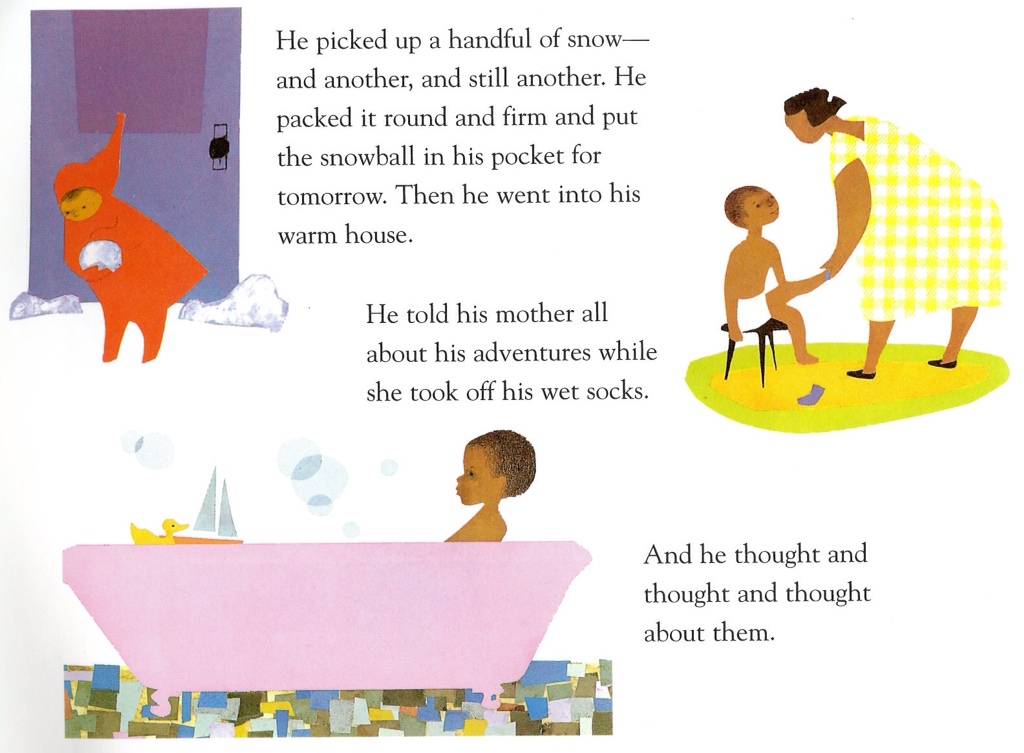 Wikipedia reports that ‘A 1965 Saturday Review article, “The All-White World of Children’s Books,” criticized Keats for not addressing Peter’s race in the text. In the 1970s, some critics argued that The Snowy Day was too integrationist, and did not truly represent or celebrate African-American cultural or racial identity.’