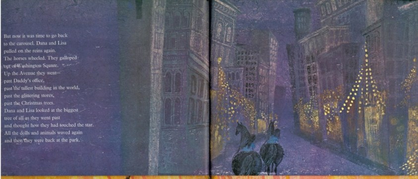 Finally they land back in Central Park, where daddy meets them as the carousel grinds to a slow halt, and they walk home, fading into the wintry night, full of giddy tales about their epic ride.