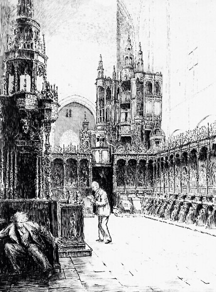 ‘Horrid old man!— that he was to be put, sitting at a table in his ordinary clothes, in a brick room that he’d had made underground in a field near his house. Of course the country people say he’s been seen about there in his old black cloak.’