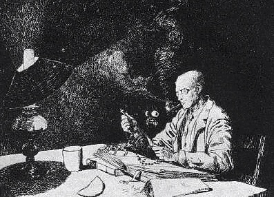 ‘Horrid old man!— that he was to be put, sitting at a table in his ordinary clothes, in a brick room that he’d had made underground in a field near his house. Of course the country people say he’s been seen about there in his old black cloak.’
