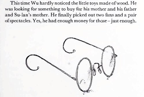 We follow Wu as he does various little jobs around the estate, earning enough pennies to buy New Year presents from the peddlar for his parents and friend. His father’s specatacles are pariculalrly choice, ‘the frames were made of tortoiseshell, the glasses blue.’ They aren’t unlike the kind chosen for the giant in Briggs’ Jim and the Beanstalk.