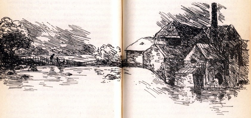‘Something had knocked down part of the fence, so we climbed over the twisted, rusty iron on to the wild patch of bushes and brambles outside the old paper mill. Long ago, they used to make paper there, using power from the weir, Sir told us. Now it’s dirty and derelict. Grey dust lies all over it, on the broken, boarded up windows.’