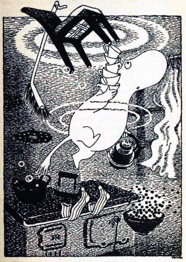 Five years later Tove wrote Moominsummer Madness, a story that borrowed heavily from these first faltering steps in theatre. She described the story in a letter to her friend Eva, ‘After a natural catastrophe the family gather round a theatre without understanding that’s what it is. On Midsummer night they are dispersed in various directions and after a muddled series of wanderings they finally come together again in the first performance of a play. All ends happily of course.’