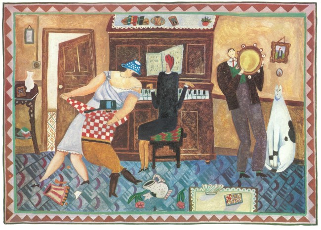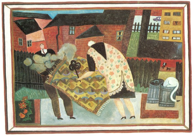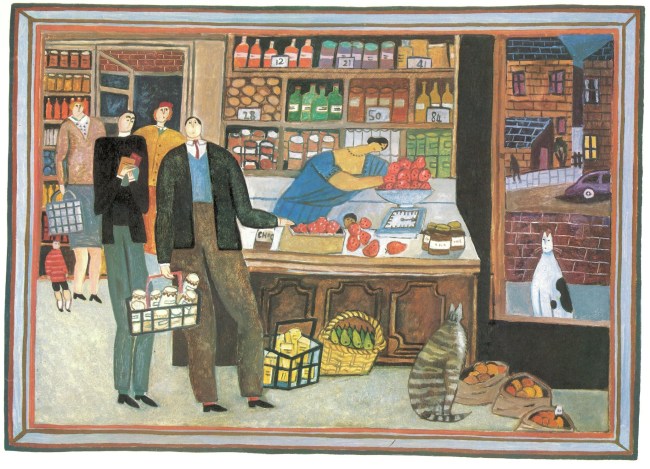 Pepper became an artistic phenomenon in the mid 70s, though at first Carrington didn’t reveal that she was the true artist. Her husband Christopher Mason writes in his biography of the artist that Pepper was more than just an art hoax, “She painted ‘Peppers’ with the same sincerity and imagination that characterised everything she did. She created a complete Pepper world… in which perspective was absent, the cats were as big as sofas and the people had tiny heads (supposedly reflecting his own mental capacity).”