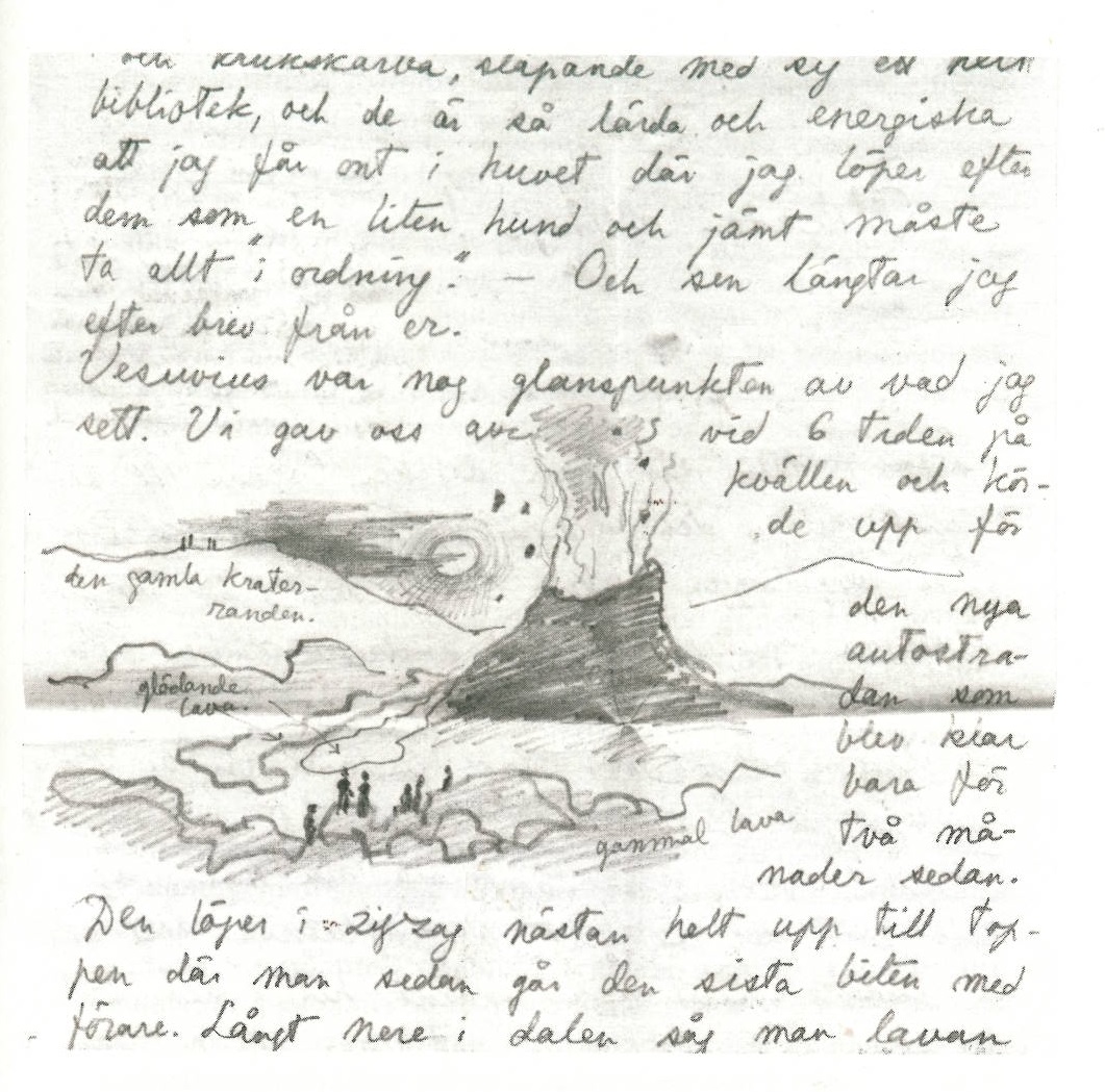 Her early travels were typically eventful. She savoured the precious last moments of peace time in Europe when she spent the summer of 1939 travelling alone to pre-apocalyptic Italy. A particularly thrilling visit to Pompeii provided the basis for one of Snuffkin’s stories in Comet in Moominland. This extract from one of her illustrated letters describes their assent of nearby Vesuvius and an atmosphere stuffed with threat.