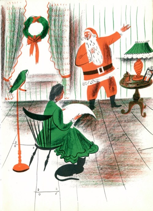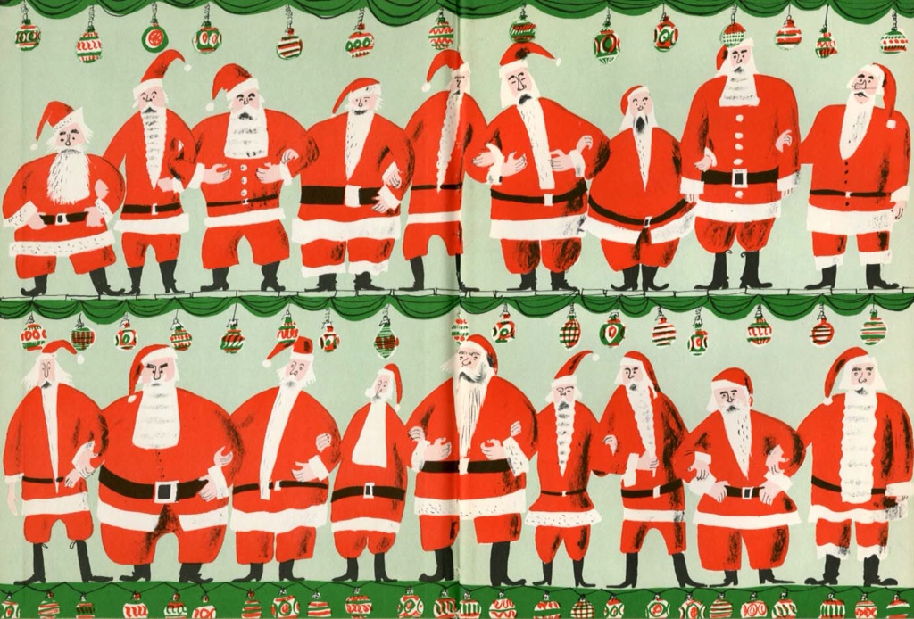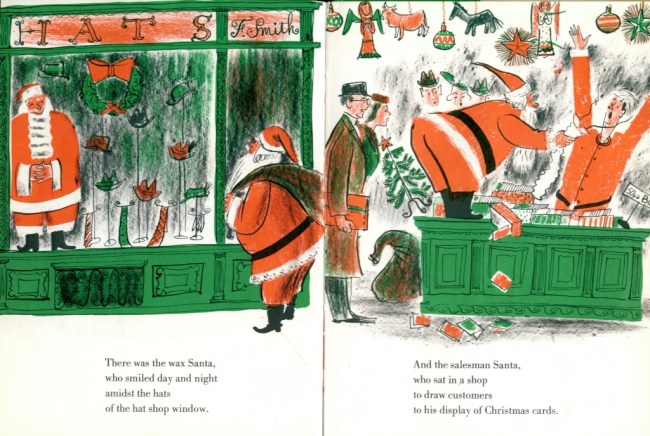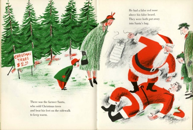 Roger Duvoisin, author of Petunia’s Christmas, brings us a Santa who is both befuddled and enraged by the festive jamboree. The objects of his ire are the countless false Santas peddling their wares on streets and in stores all across the world.