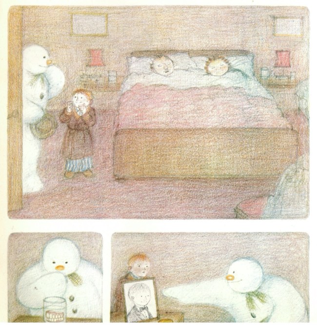 This internal logic extends to the classic conclusion. The snowman melts. All things must pass. The final image, a single panel surrounded by white paper is still supremely powerful: The boy stands with his back to us staring at the remains of the snowman. The reader, looking the same way, is invited to stand in his shoes (or slippers) and face the hard reality of what comes to us all.