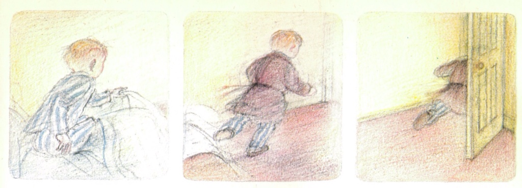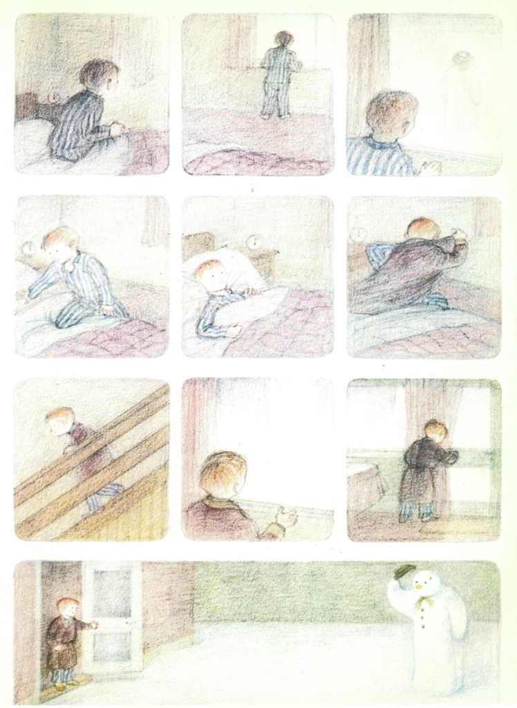 This internal logic extends to the classic conclusion. The snowman melts. All things must pass. The final image, a single panel surrounded by white paper is still supremely powerful: The boy stands with his back to us staring at the remains of the snowman. The reader, looking the same way, is invited to stand in his shoes (or slippers) and face the hard reality of what comes to us all.