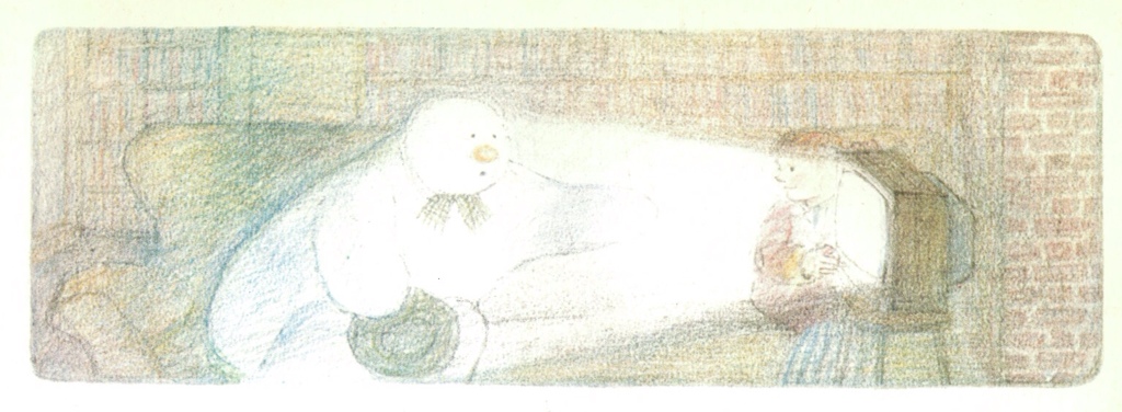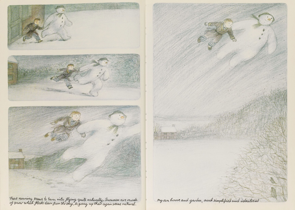 Despite its dreamlike quality there’s a ruthless logic to everything that happens in the book. Including flying snowmen, ’Fast running seems to turn into flying quite naturally. Snowmen are made of snow which floats down from the sky, so going up there again seems natural.’