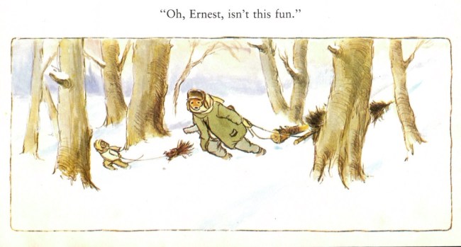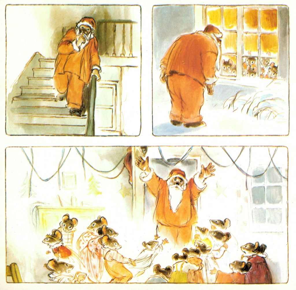 The opening scene in which Celestine reminds Ernest of his promise of a Christmas party is a masterclass. The background shows the fun and games going on in the snowy park, but all your attention is on the interaction between the bear and mouse. Like the boy in the Fry’s chocolate ads, Celestine runs the entire gamut of emotions, entreating, arguing and sulking as Ernest attempts to explain that they are too poor to throw a party.