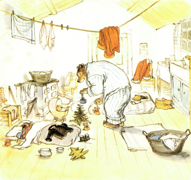 They transform their draughty, shabby, house into a warm, candle lit grotto. The party thrums with excitement. Music jumps off the pages in the second half of the story, as Ernest comes into his own, as a fiddle playing, singing and dancing Santa bear.