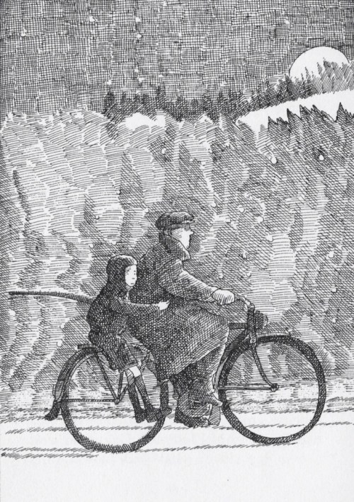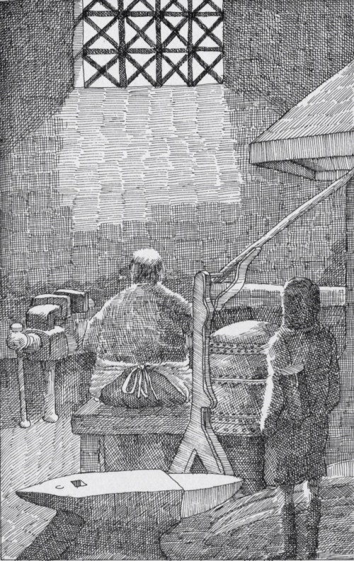 But it’s the scenes where William visits Joseph in his forge that the real magic happens. Each part of The Stone Book has featured perfect prose descriptions of the different crafts and skills practiced in the village. Now the forge comes flaming to life through Garner’s wonderful language and Michael Foreman’s heavy, atmospheric pen and ink lines.