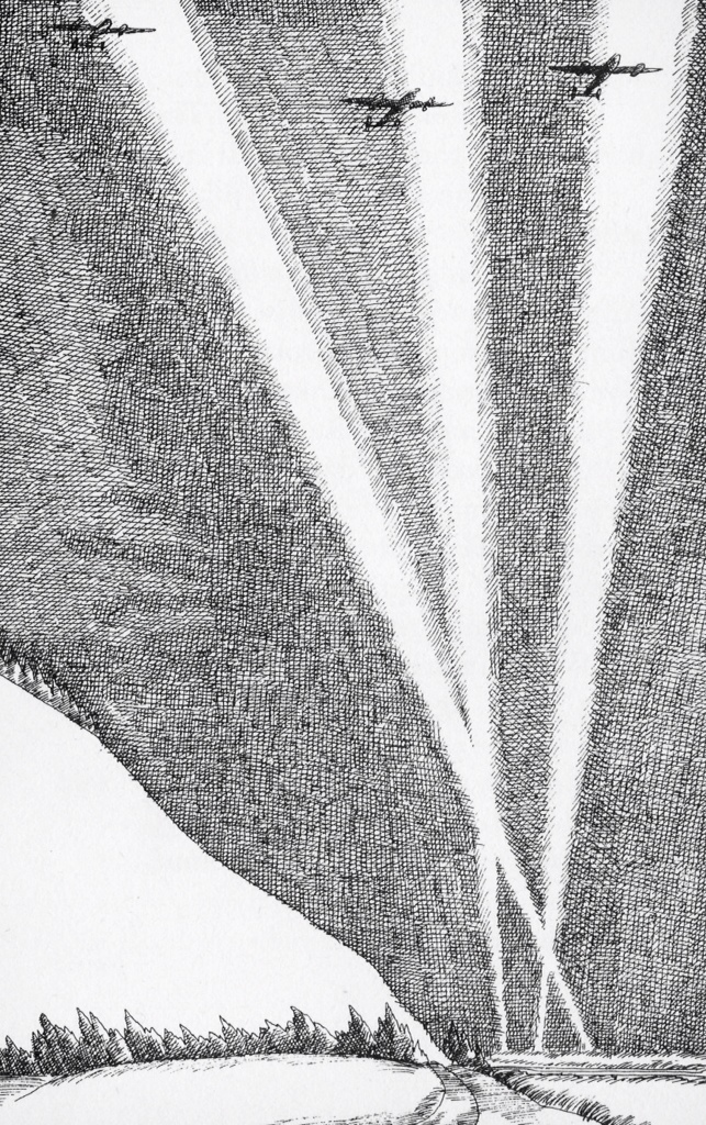 ‘He came in on the bombers from above and out of the sun. Two crossed his sights and he gave them a burst. They went down together. Another tried to dodge him and crashed. He raced through the pack and settled on the leader’s tail. The leader climbed hard at the hump, but William caught his fusilage with a runner and the leader spun out of control and hit the tree.’