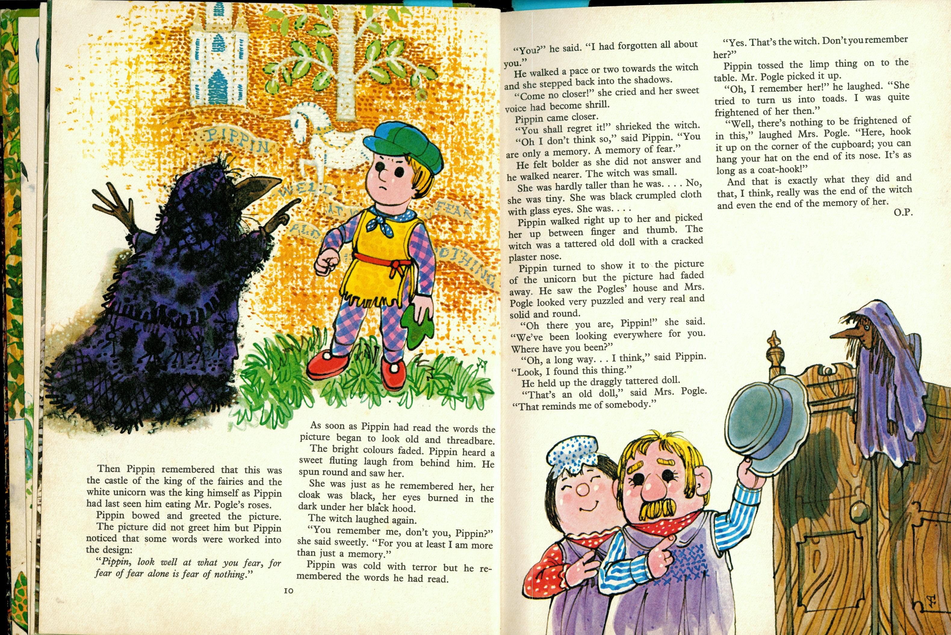 In the end Mr Pogle takes posession of the fairy king’s crown and defeats the witch in a magic contest, banishing her with an all consuming spell that chills with its finality. The witch is condemned to be ‘no thing at all, no shadow, no thought, no terror, no memory of evil, no touch of cold to foul the night, no thing at all… be!’