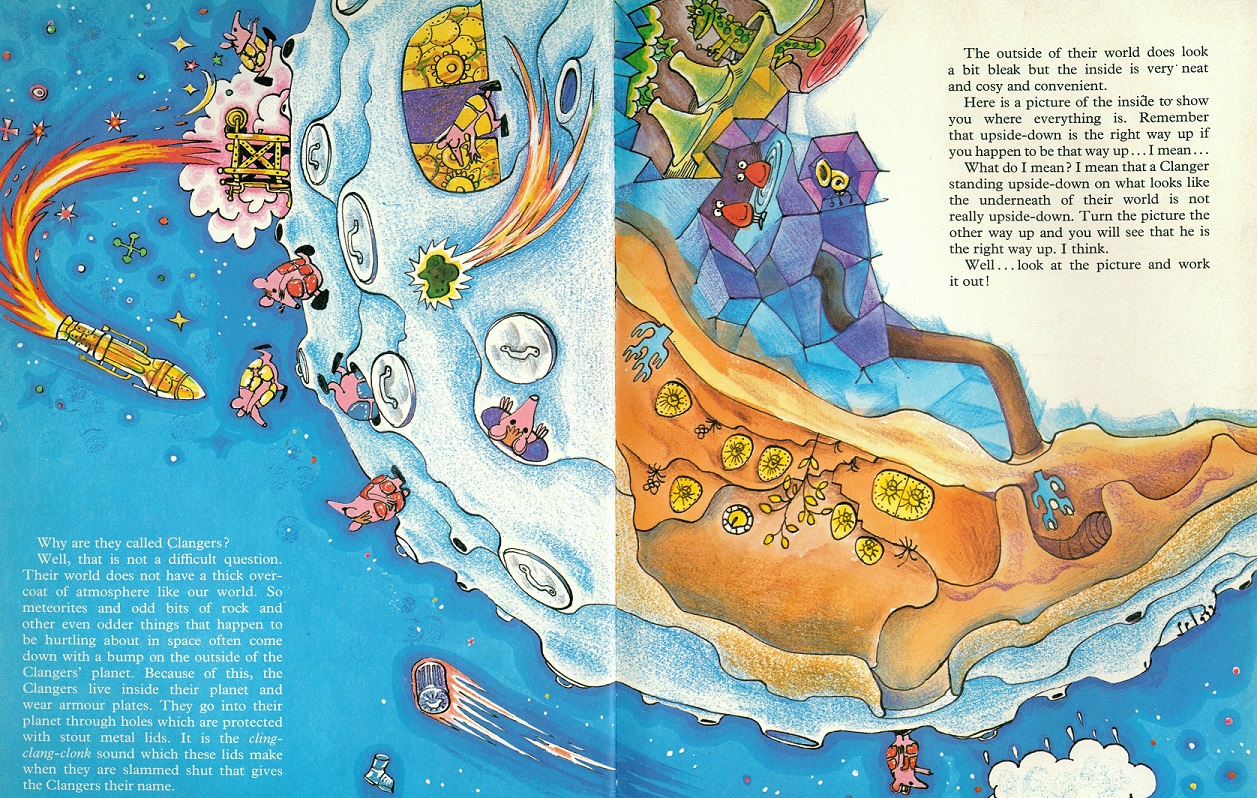 Developing the Clangers, Oliver Postgate realised his knowledge of the booming sci-fi genre was restricted to some long distant memory of H.G. Wells and the imaginations of his twin sons. ‘When they were about three years old Simon and Stephen had told me about the moon. Apparently there was a giant called Edward on the other side of the moon who lived on soup, hot soup. I asked how he obtained the soup and they explained that as the moon was quite full of soup, all he had to do was unscrew a volcano and suck it out through a straw.’