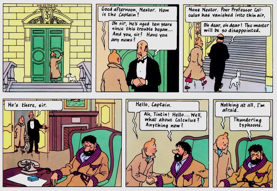 Hergé and Jacobs returned from exile in 1946, and continued where they’d left off. Though these opening frames make pointed reference to their enforced absence. Just look at Haddock’s fabulous brooding expression.