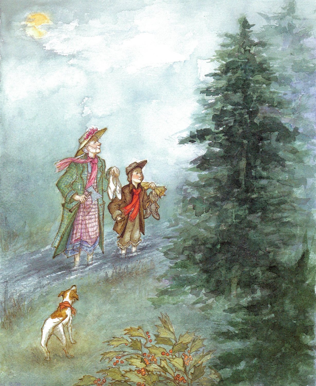 Decorations are of course home-made, ‘I make sketches and my friend cuts them out: lots of cats, fish too, some apples, some watermelons, a few winged angels devised from saved up Hershey bar tin foil.’ It’s a scene reminiscent of the hand made decorations in the Shirley Hughes classic Lucy and Tom’s Christmas and there’s a similarity too in illustrator Beth Peck’s painting style.