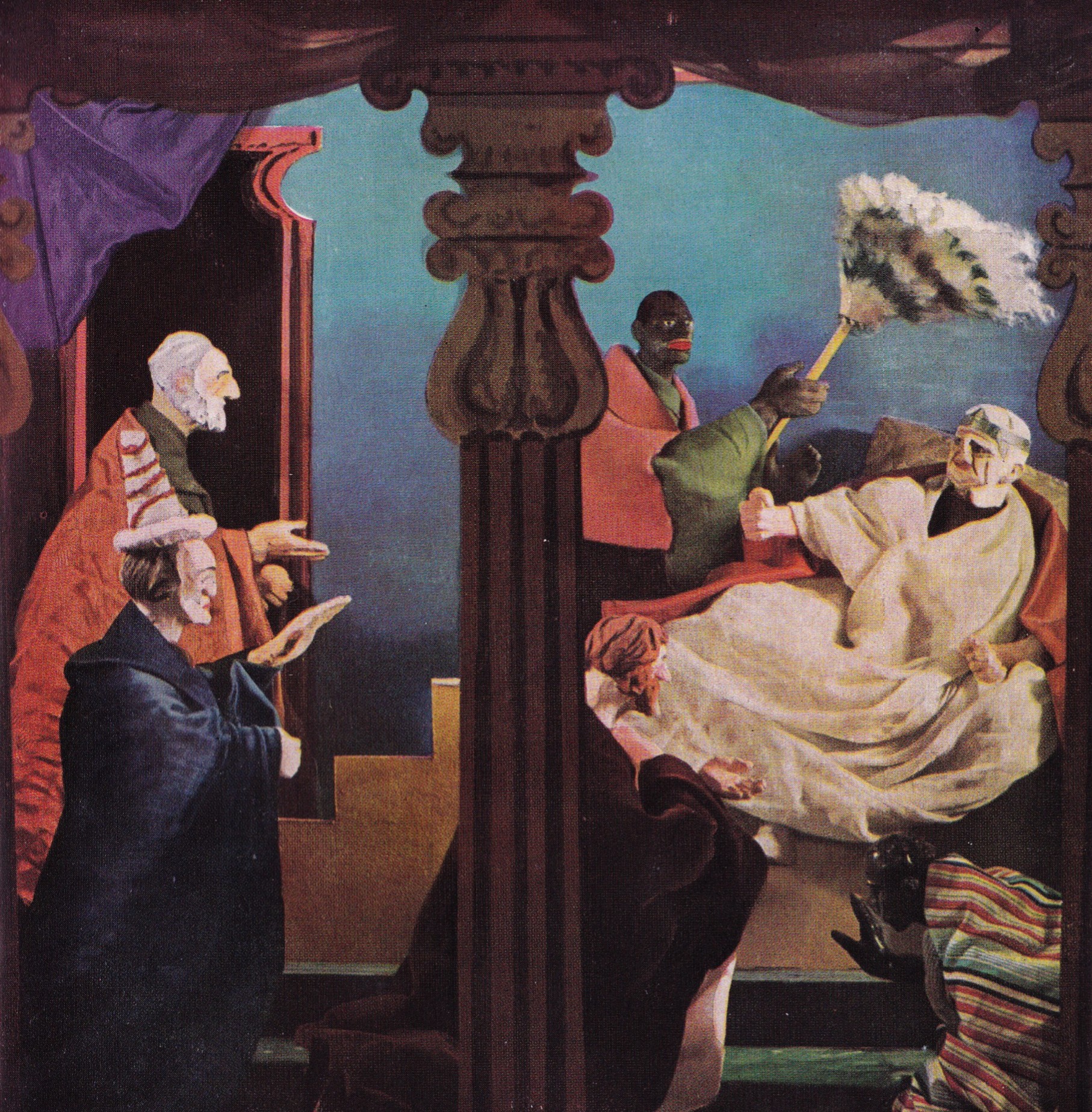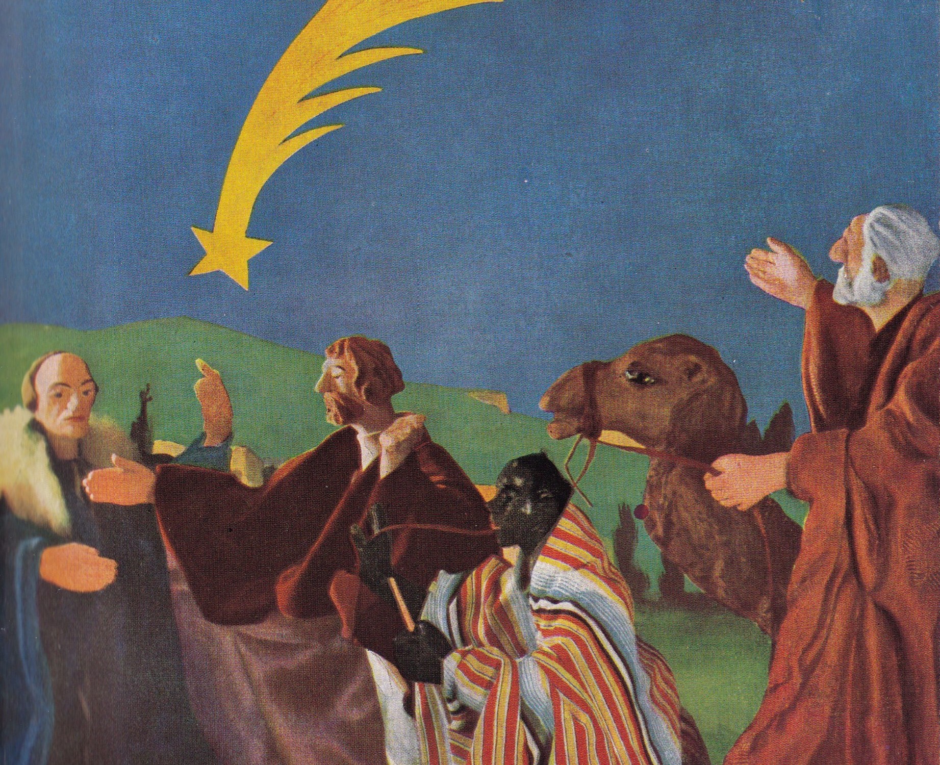 The wise men arrive, casting their noble glow on the lowly peasants. ‘The sun was sinking. It flashed on the jewels the wise men wore; it glinted on their jingling harness… it was plain that they were great and powerful men.’