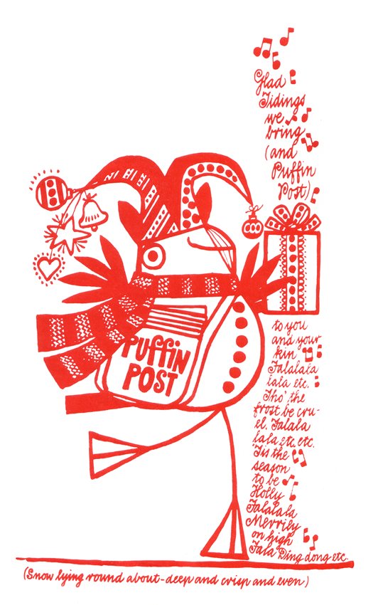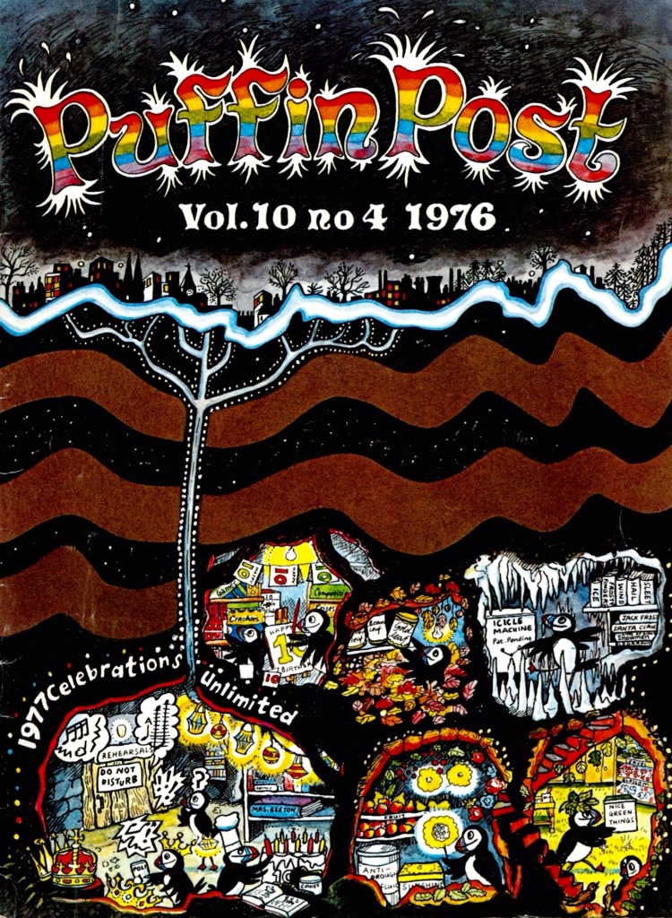 Puffin Post was a quarterly magazine for subscribers of the Puffin Club, Kaye’s groundbreaking enterprise that brought readers and writers of children’s books together. The fourth magazine of each year didn’t quite fall in December, but Kaye ‘loved the paraphernalia of Christmas’ and commissioned some extremely memorable festive illustrations for the magazine.