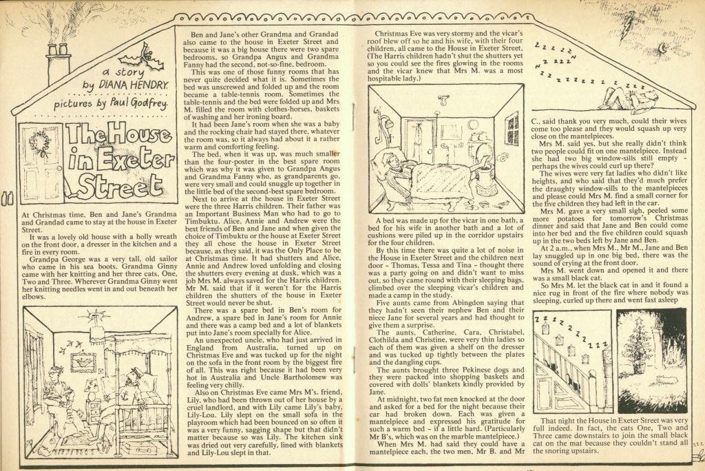 The winter issues would often feature a specially commissioned Christmas tale. Pictured here is Diana Hendry and Paul Godfrey’s The House on Exeter Street, a comic riposte to the idea of there being ‘no room at the inn.’ The story was reworked in 1989 as a full picture book, which you can read about here.
