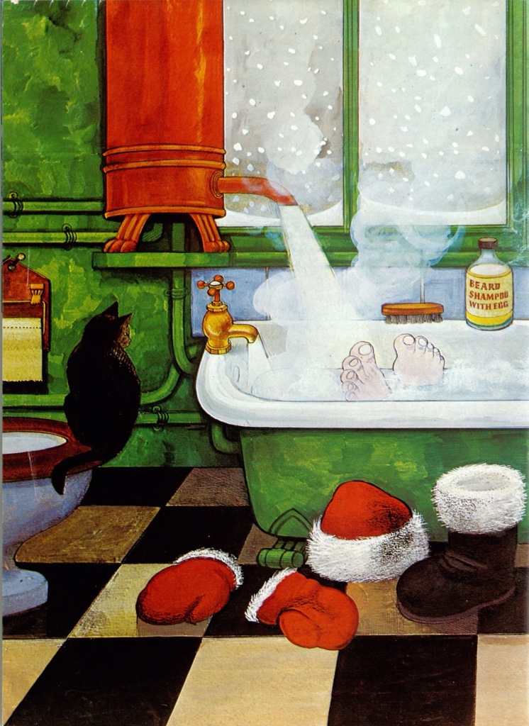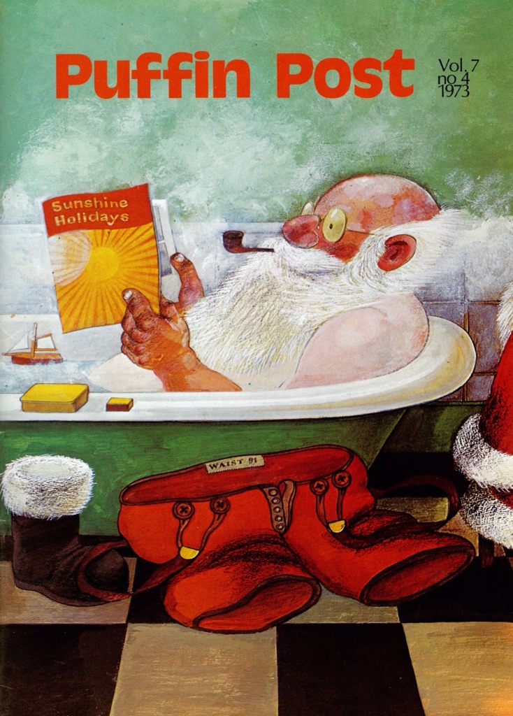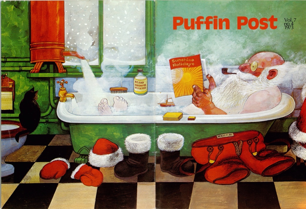 Kaye was a force of nature, and used her special skills of persuasion on many authors to obtain contributions for Puffin Post magazine. Raymond Briggs came into her sights on a visit to his Sussex home around the time of the publication of Father Christmas. On his desk she spotted one particularly special acquisition, a painting of Father Christmas relaxing in the bath with a travel brochure. He explained that Hamish Hamilton had rejected the image for the cover of the book, and Kaye immediately seized it and put it in the winter edition of Puffin Post.