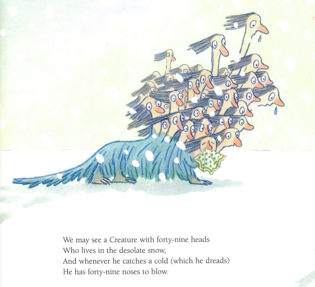 Another Centipede Song illustrated by Chris Riddell‘If you are illustrating the book you can draw the centipede waving his many boots and singing; but you can’t really ask for two or three extra pages to show all the bizarre things that are mentioned.’ Quentin Blake in his introduction to Songs and Verse.