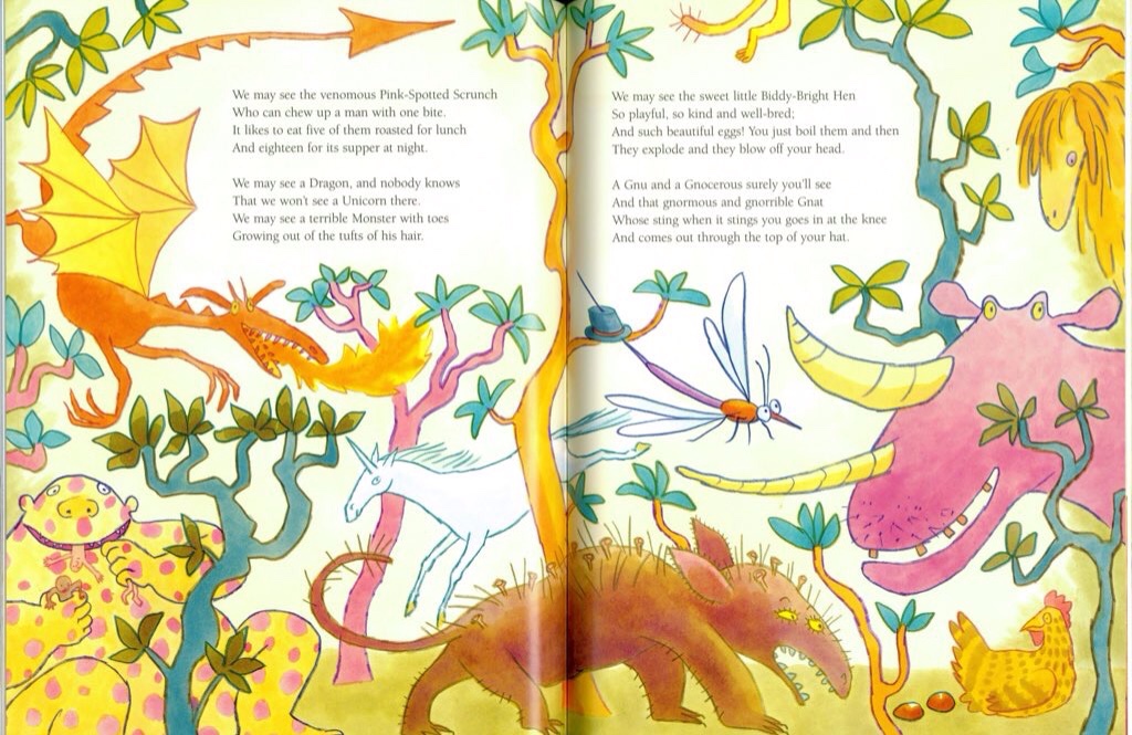 Songs and Verse presents poems from across all of his books, plus some unpublished work, all with brand new illustrations from some of the best in the business, including Chris Riddell, Posy Simmonds, Lauren Child and Emma Chichester Clark (above). Visually it’s very special, but the big revelation are the words. Taken out of narrative context and given their own platform they often work beautifully – showcasing Dahl at his inventive best, and sometimes his most remorselessly unforgiving.