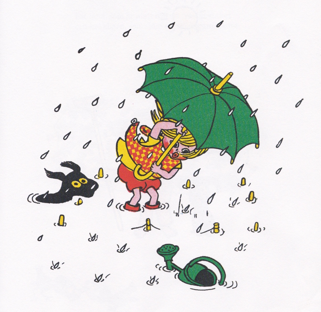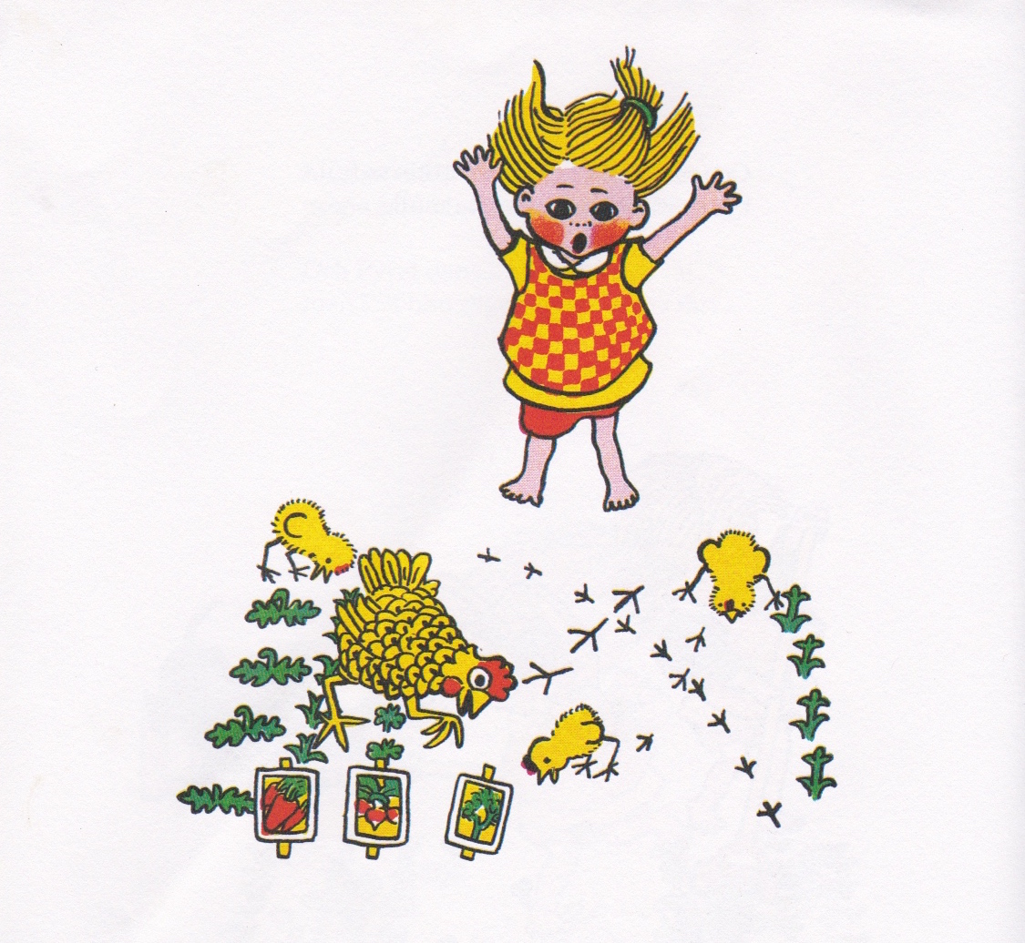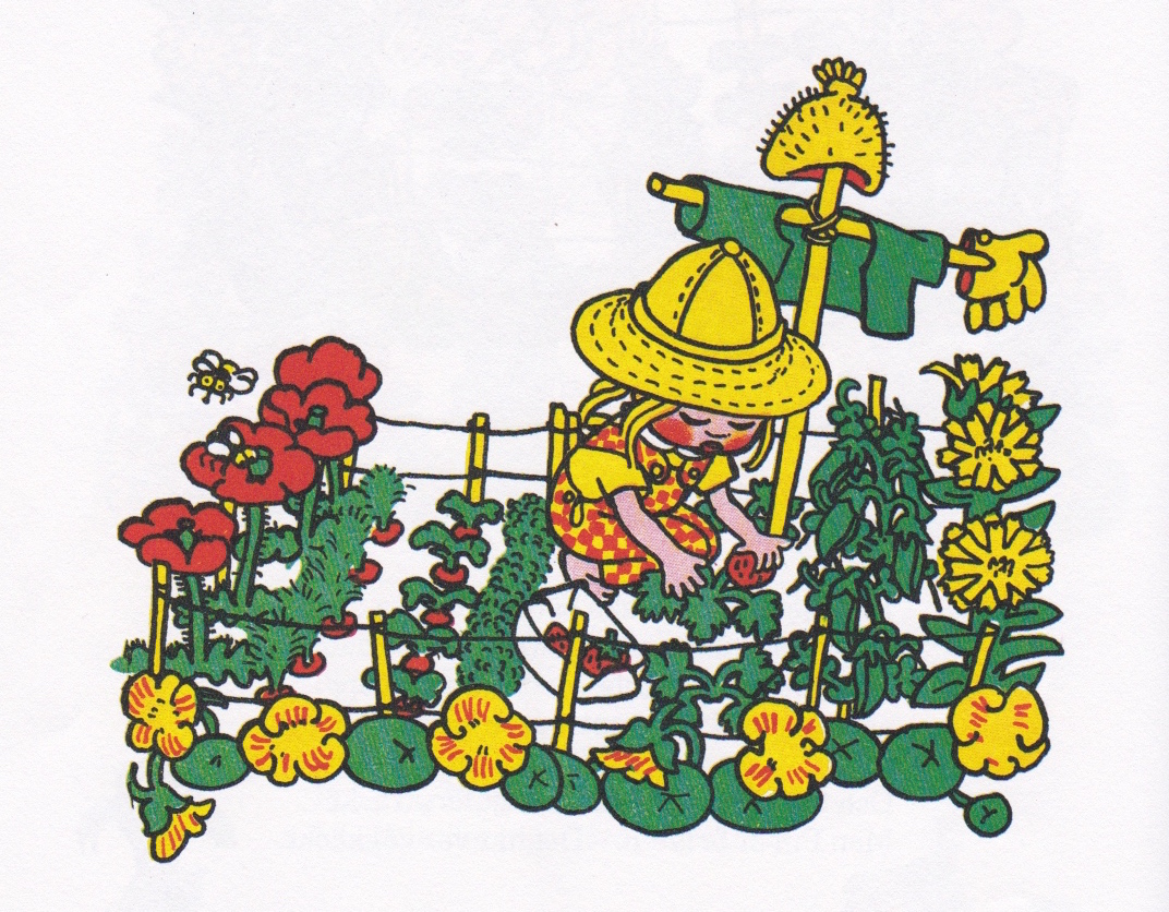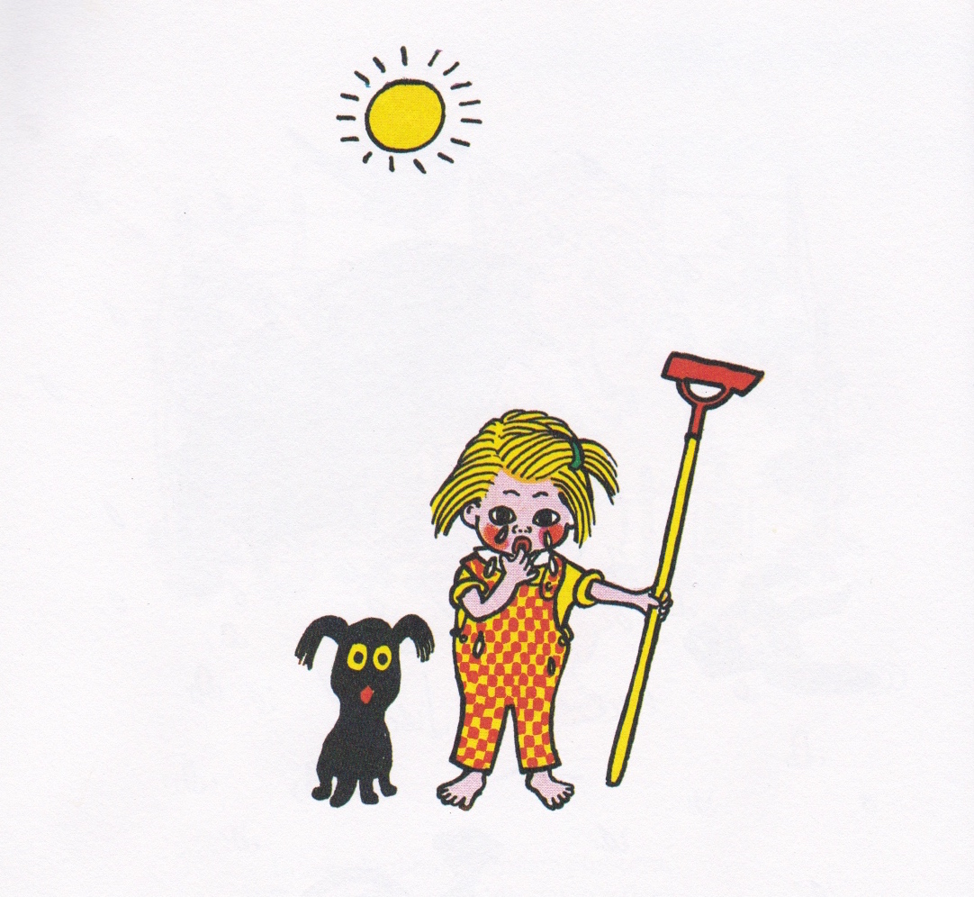 Set against a white background with Zen like simplicity, we follow the travails of rosy cheeked pre-schooler Pyret as she goes about planting her own allotment – aided by her faithful black dog Piff.