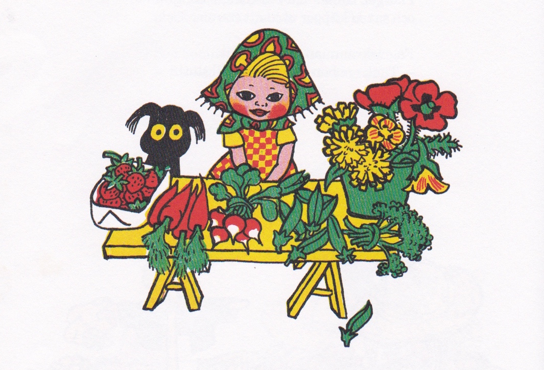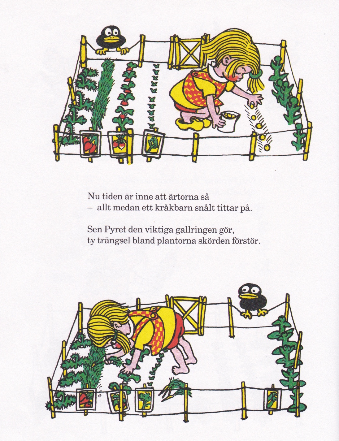 During her run illustrating for Astrid Lindgren, Ingrid became much in demand and collaborated with a number of authors, including another Swede Ulrika Widmark on the 1947 picture book Pyret och Piff Planterar (Pyret and Piff’s Garden).