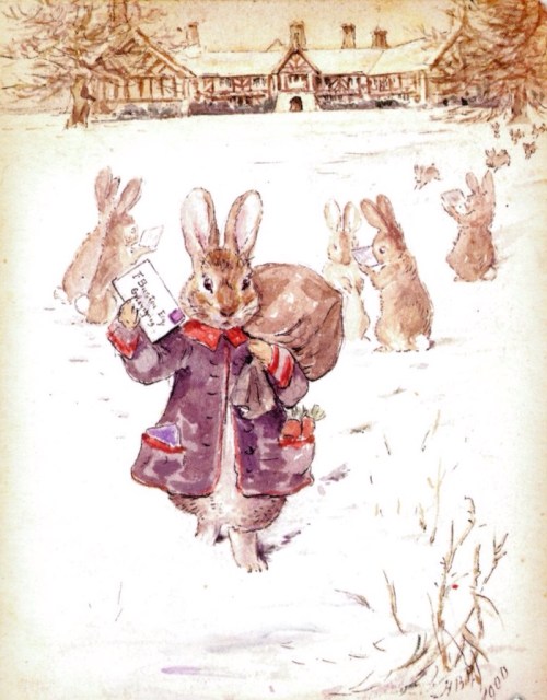 Although Beatrix Potter only wrote one classic Christmas story (the Tailor of Gloucester), she returned to the season in different ways throughout her career. A prodigious letter writer, Potter designed cards and sent fans seasonal missives from her characters, like this one from Peter Rabbit.