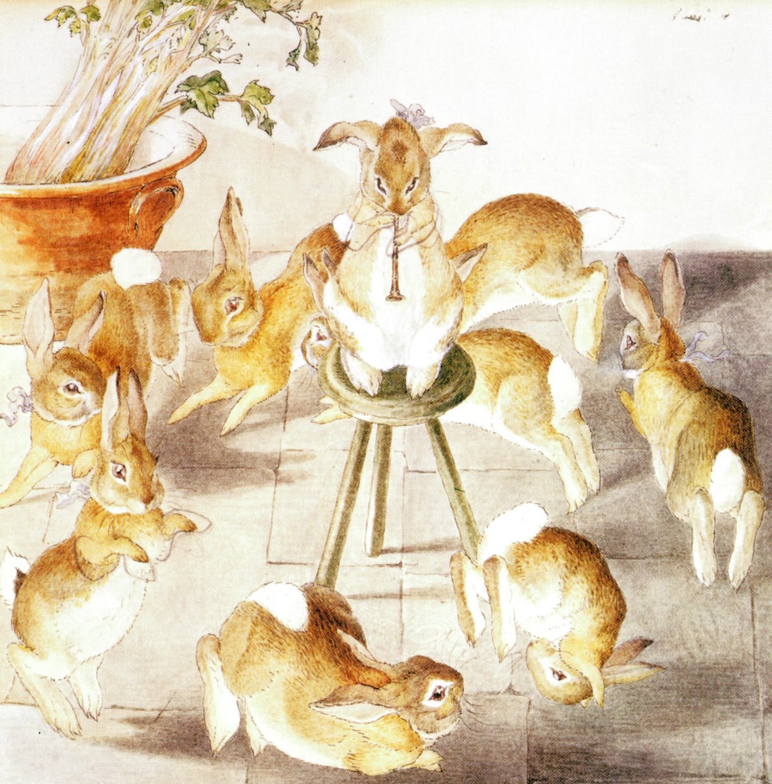 The last of our parties dates from early in Potter’s career, a series of six paintings made in the early 1890s depicting a family of rabbits enjoying a series of traditional Christmas diversions, like roasting apples around a blazing fire.