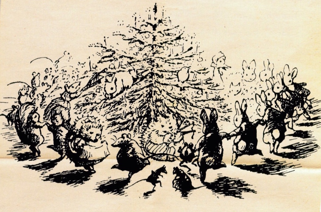 ‘You know we do not move our tree; we leave it growing in the wood. When Christmas-tide is over, it looks like any other little fir tree. But you should see it on Christmas Eve! All aglow with fairy lights and hung with hips and haws and holly berries & nutcrackers and mouse toffee in silver paper and nutcrackers and garlanded with chains of sparkling icicles. Then all of us little animals dance round, around, around while Cock Robin sings overhead and Pricklepin plays the bagpipes.’