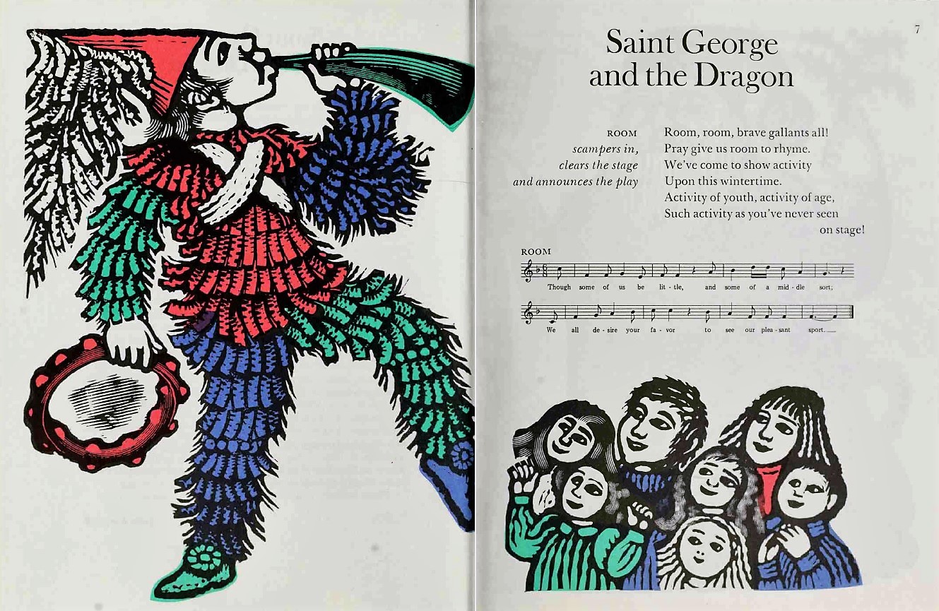 The text is provided by John Langstaff, an American early music specialist and Caldecott winning children’s writer. In 1957 Langstaff founded the ‘Christmas Revels’ a theatrical tradition that draws on English medieval traditions like the mummers and has been running across the United States ever since. According to his biographer and fellow Reveller, the Dark is Rising author Susan Cooper, Saint George and the Dragon formed the basis of every performance.
