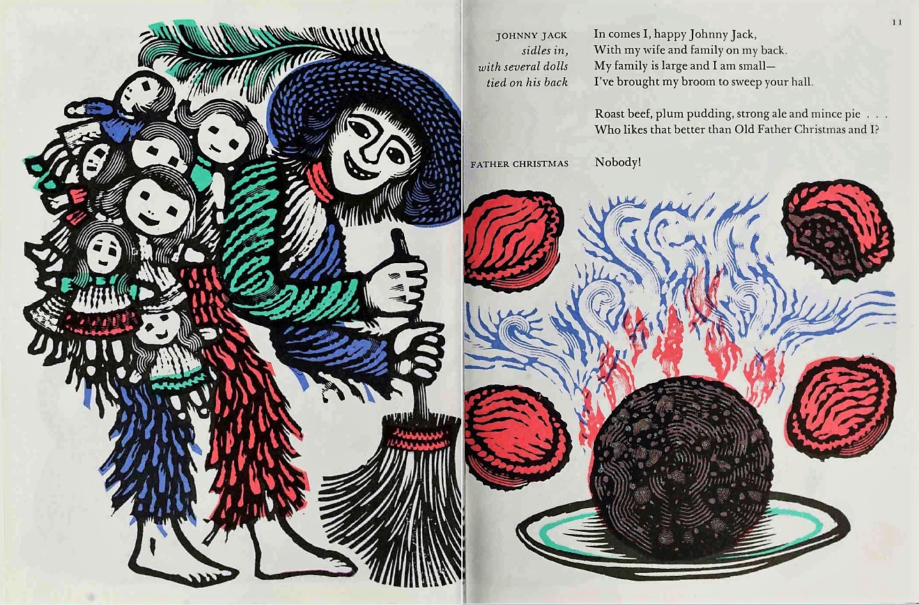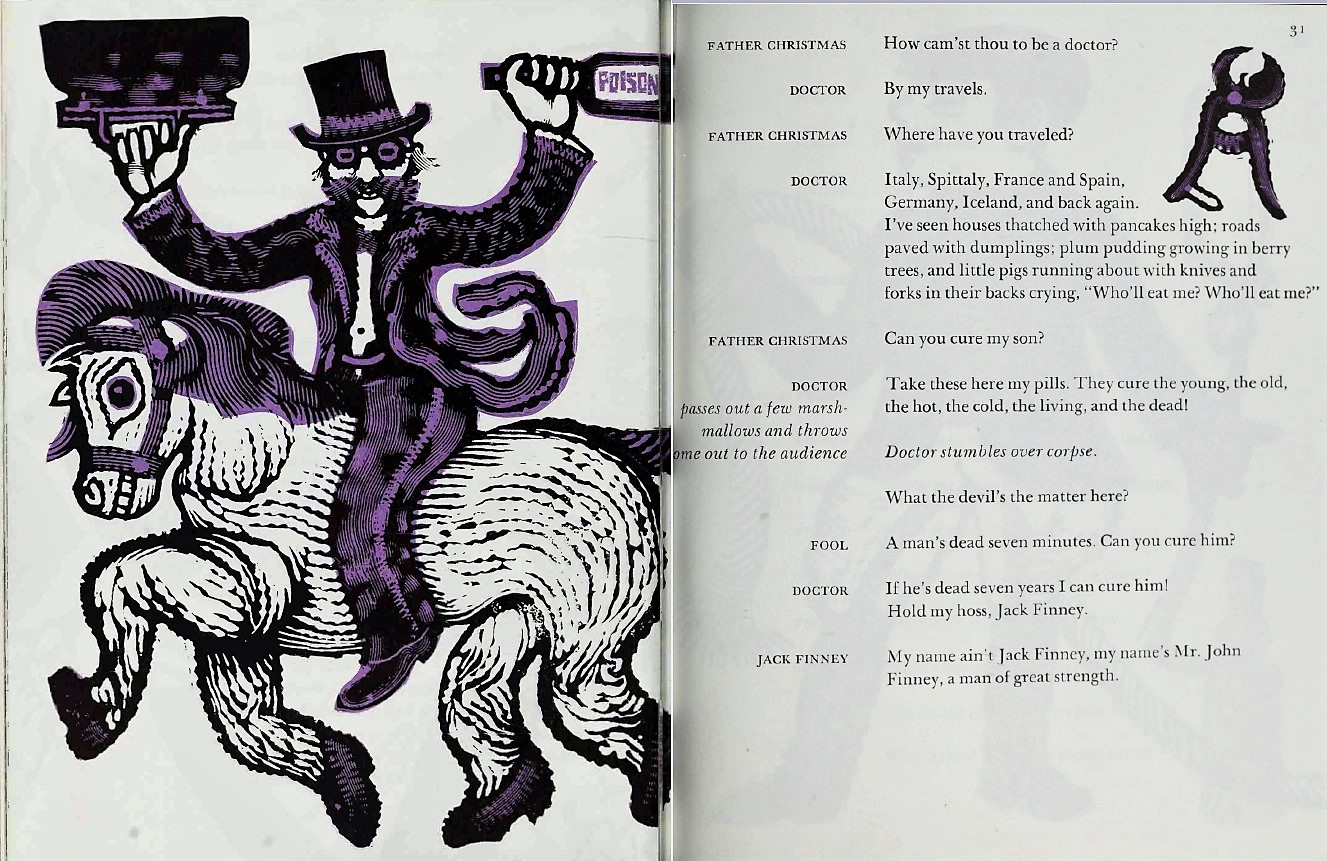 David Gentleman provides illustrations for this beautiful 1973 edition of the play. He’s a fine choice, not only a master of the woodcut, but trained by Edward Bawden and John Nash, and an acolyte of Eric Ravilious. Through them Gentleman has a connection to a particular seam of nostalgic Englishness that suits the mummers perfectly.