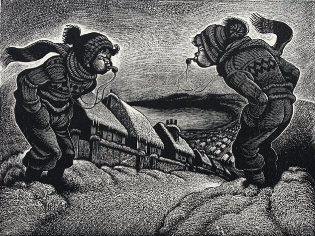 ‘Years and years ago, when I was a boy, when there were wolves in Wales, and birds the colour of red-flannel petticoats whisked past the harp-shaped hills, when we sang and wallowed all night and day in caves that smelt like Sunday afternoons in damp front farmhouse parlours, and we chased, with the jawbones of deacons, the English and the bears, before the motor car, before the wheel, before the duchess-faced horse, when we rode the daft and happy hills bareback, it snowed and it snowed. But here a small boy says: “It snowed last year, too. I made a snowman and my brother knocked it down and I knocked my brother down and then we had tea.”’