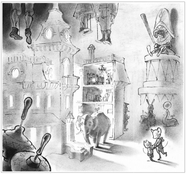 The mice are finally reunited with their friends from the toyshop, an uppity plush elephant, a seal with a missing ball on his nose and the doll’s house itself; once their grand dwelling in the toyshop it has also found its way to the dump, becoming the HQ of Manny and the cream of rat society.