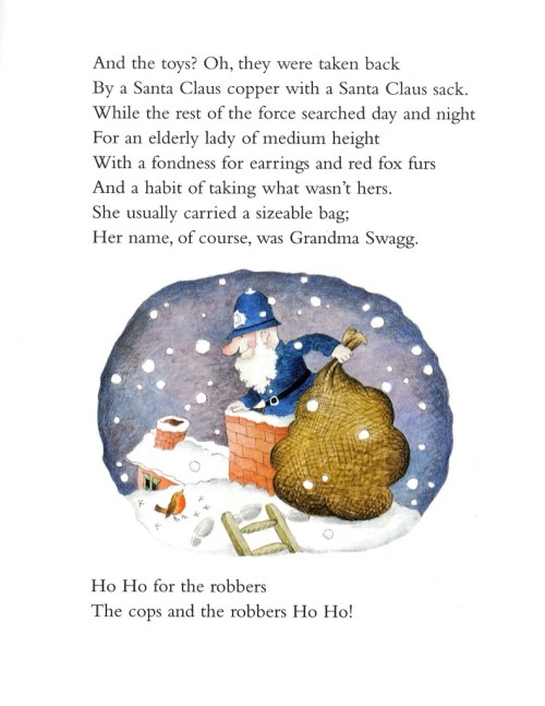A favourite sub-genre of Christmas stories for children is the festive crime caper. The Grinch Who Stole Christmas, Home Alone and that episode of the Simpsons where Bart burns down the tree and blames it on burglars. Perhaps it plays into a sense of unease about a festival that allows a an old bearded man to creep into your children’s bedrooms in the dead of winter.