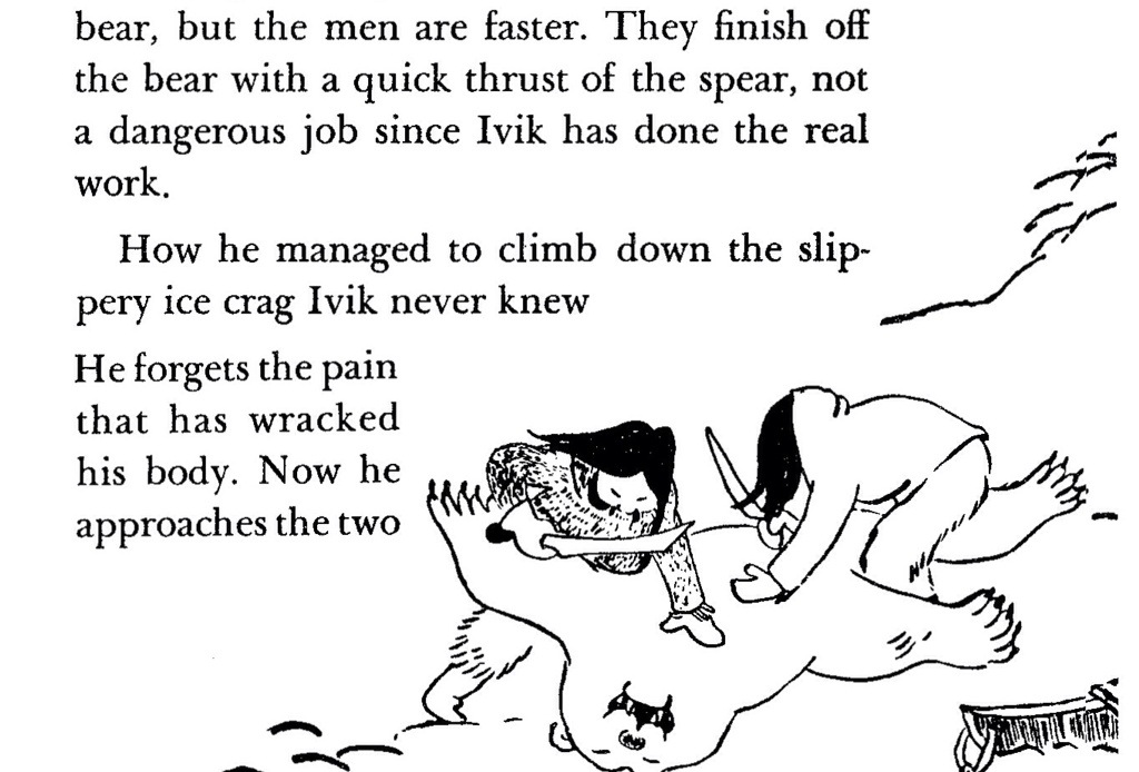 Peter had already written a number of books on the lives of the Inuit, which were adapted into the gritty MGM movie Eskimo in 1933 (in which he also starred). Although writing for a younger audience than her father, Pipaluk also remained true to the harsh existence of the Inuit people. The book has an almost documentary feel, its stories read as if they’ve been written word for word from first hand accounts. It’s shockingly vivid for a children’s book. In the opening chapter Ivik sets out full of pride on his first hunting expedition with his father.