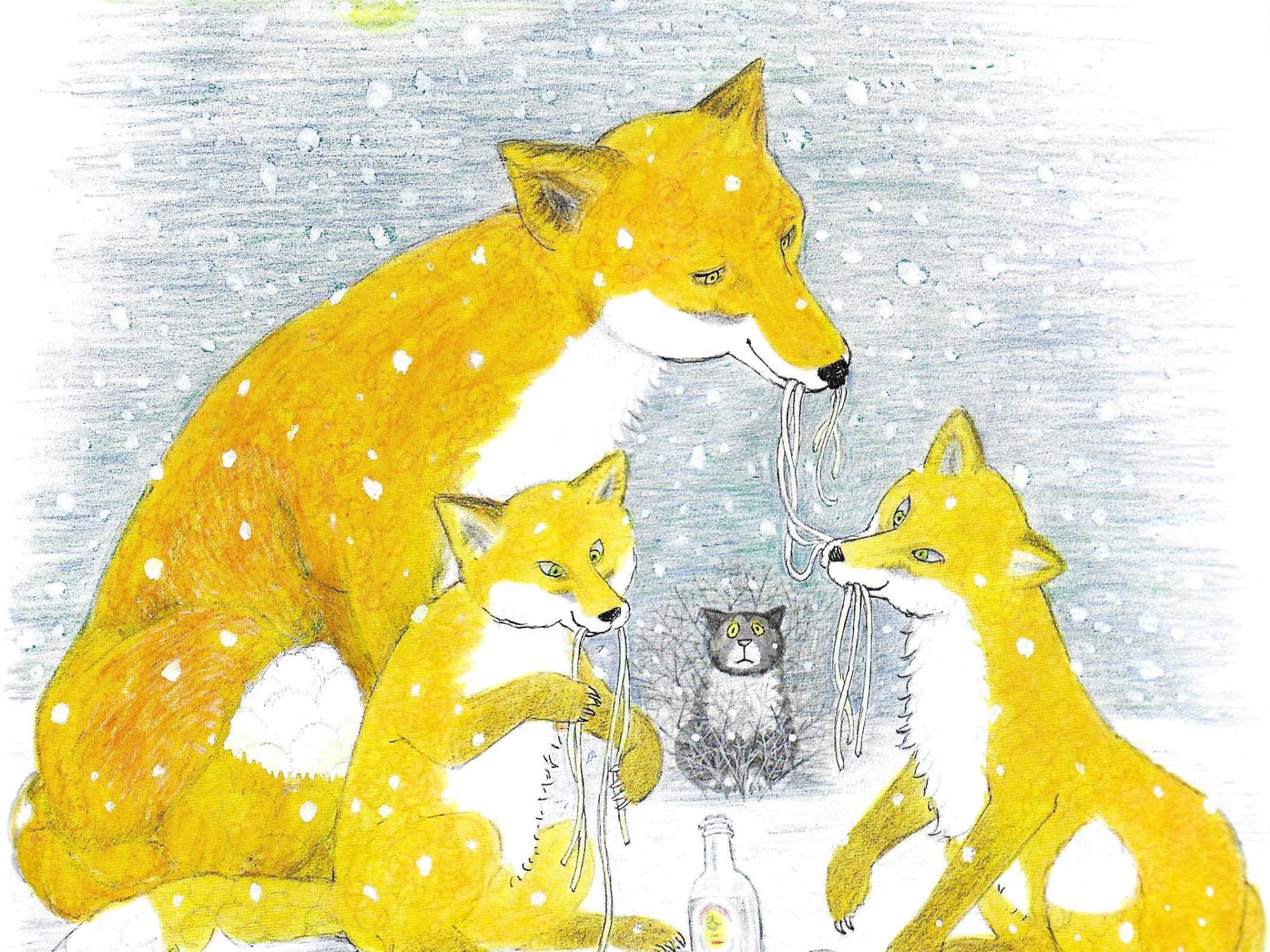 As in her other classic snowy adventure, Mog’s Christmas, the cat is outraged by this unreasonable human behaviour and takes herself out into the cold where she falls asleep. She is woken by a family of foxes helping themselves to the food she has rejected.
