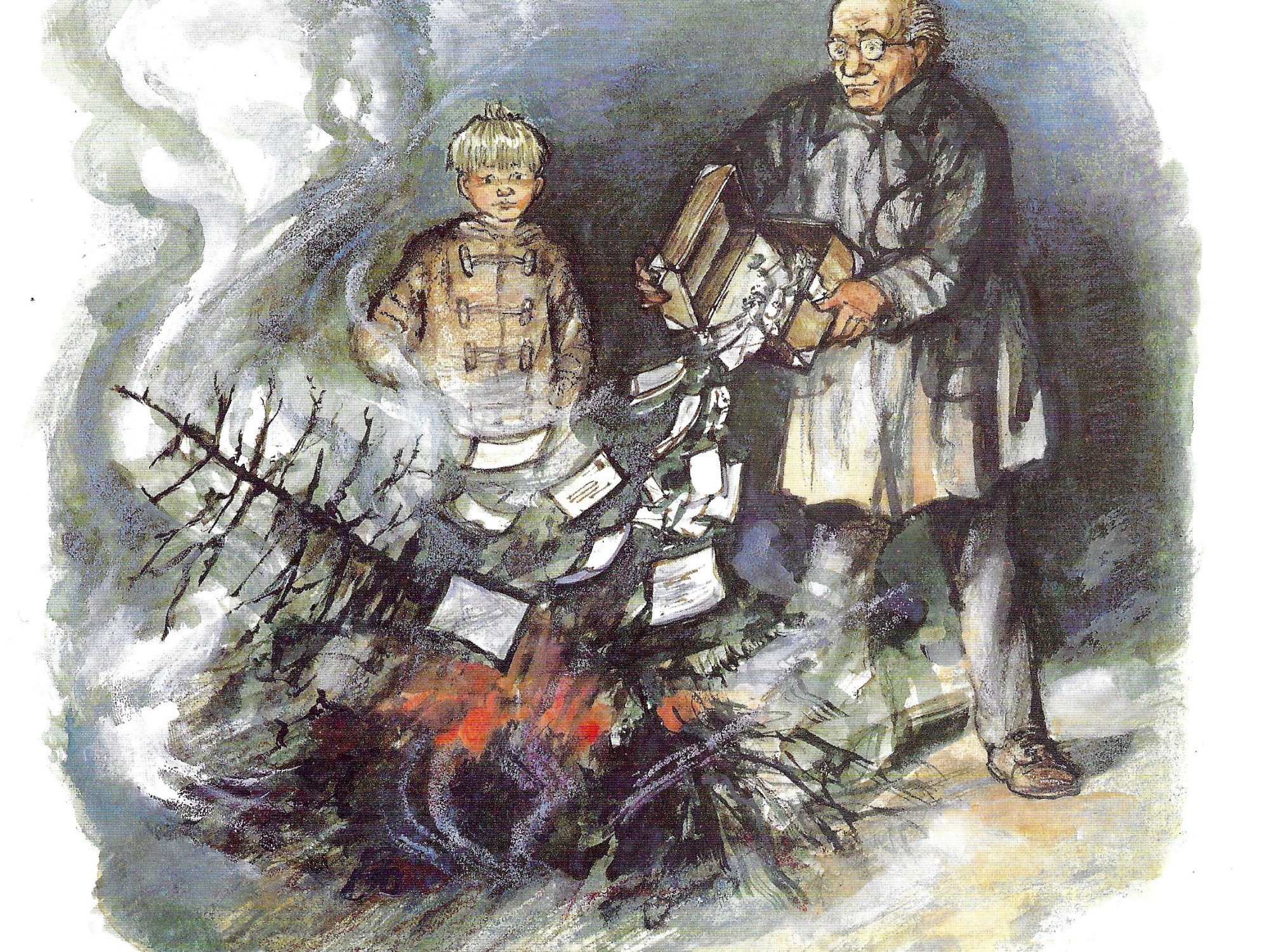 ‘I happened to see out of my window one winter evening; an older man and his little grandson sharply outlined against a blazing Christmas tree on a bonfire.’
