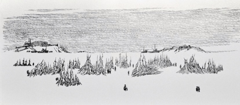 ‘On the morning, Daddy and I get up at six o’clock because Christmas trees must be bought in the dark. We walk to the other end of town as the big harbour is just the right setting for buying a Christmas tree. We spend hours choosing, looking at every branch suspiciously. It’s always cold. Once Daddy got the top of a tree in his eye. The early morning darkness is full of freezing bundles hunting for trees and the snow is scattered with fir twigs. There is a menacing enchantment about the harbour and the market.’
