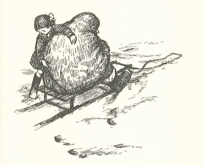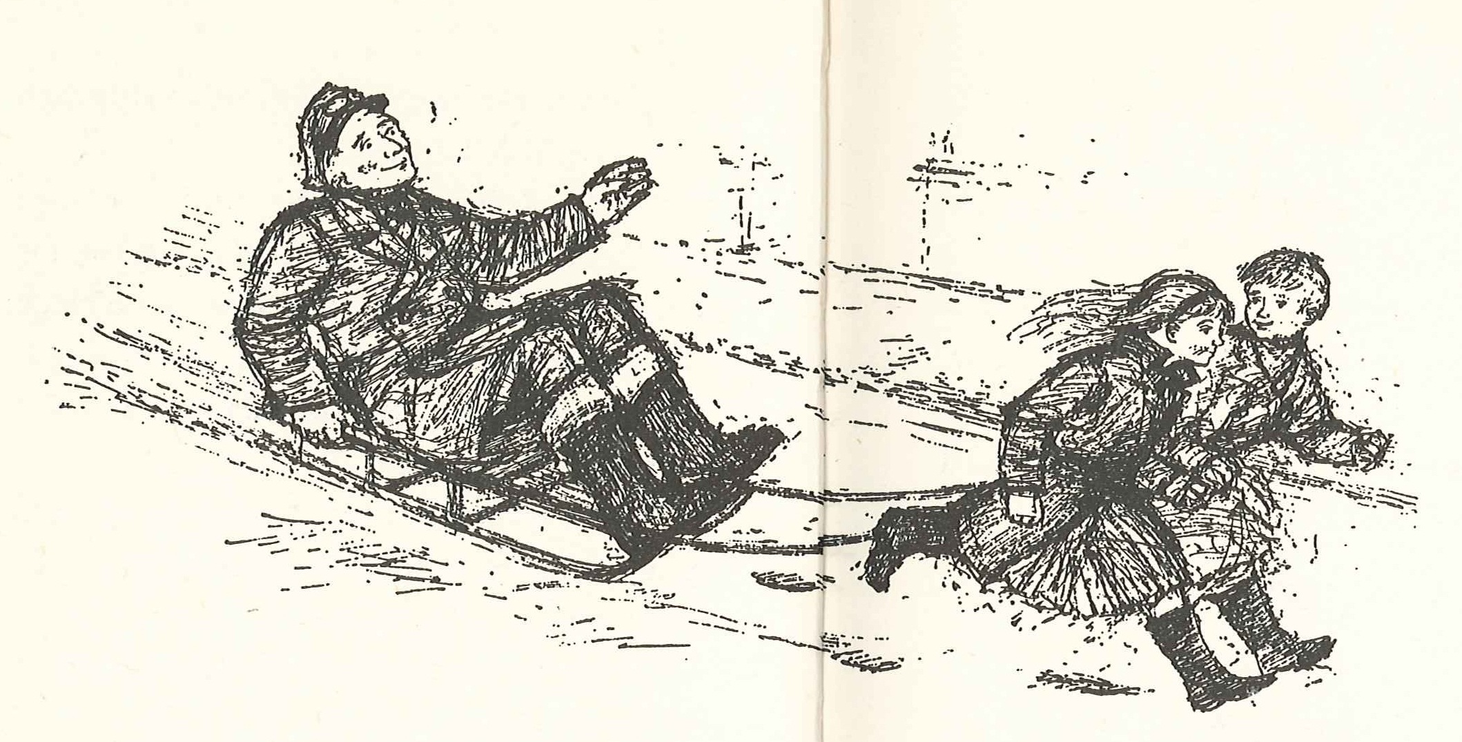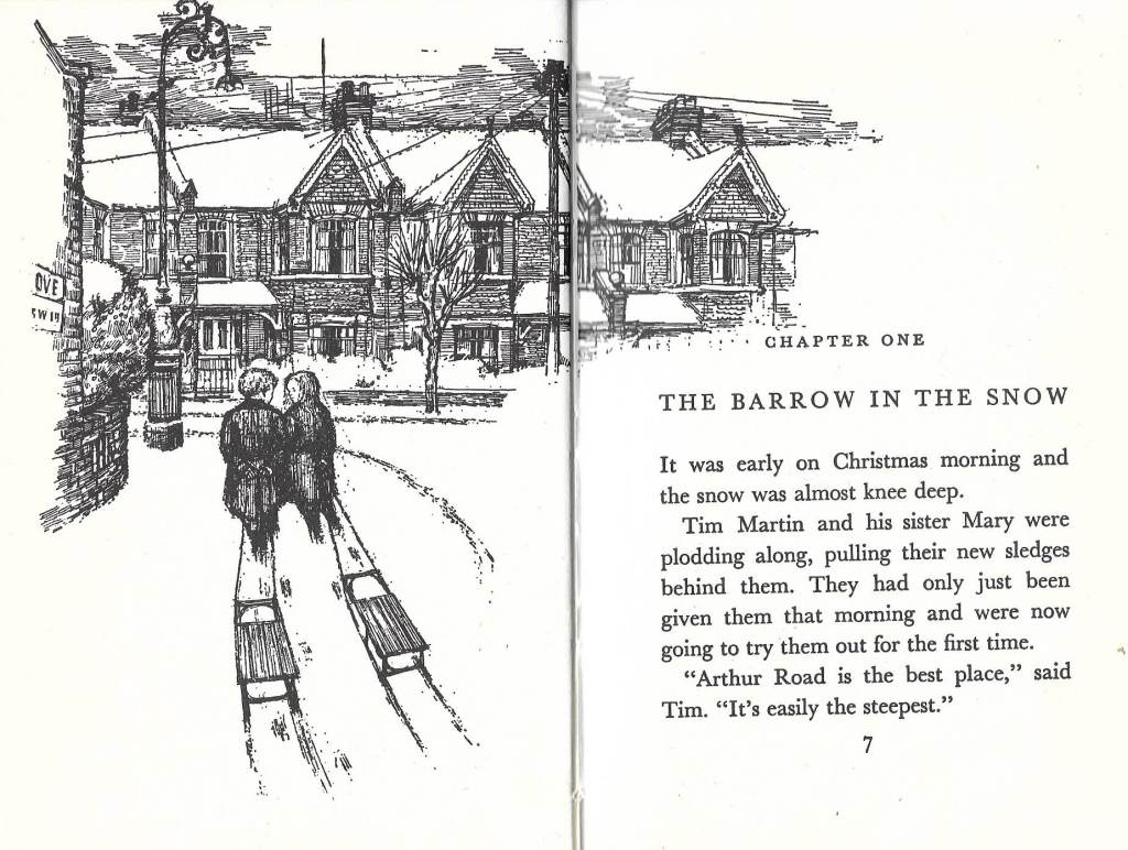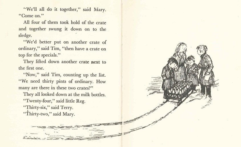 There’s a good deal of social realism in the story; the children may be little saints, but the hardness of life for working class families is unflinchingly portrayed. The sight of Ernie collapsed at the foot of his barrow is sad, but the later picture of him bundled and helpless onto the back of one of the children’s sledges is heartbreaking.