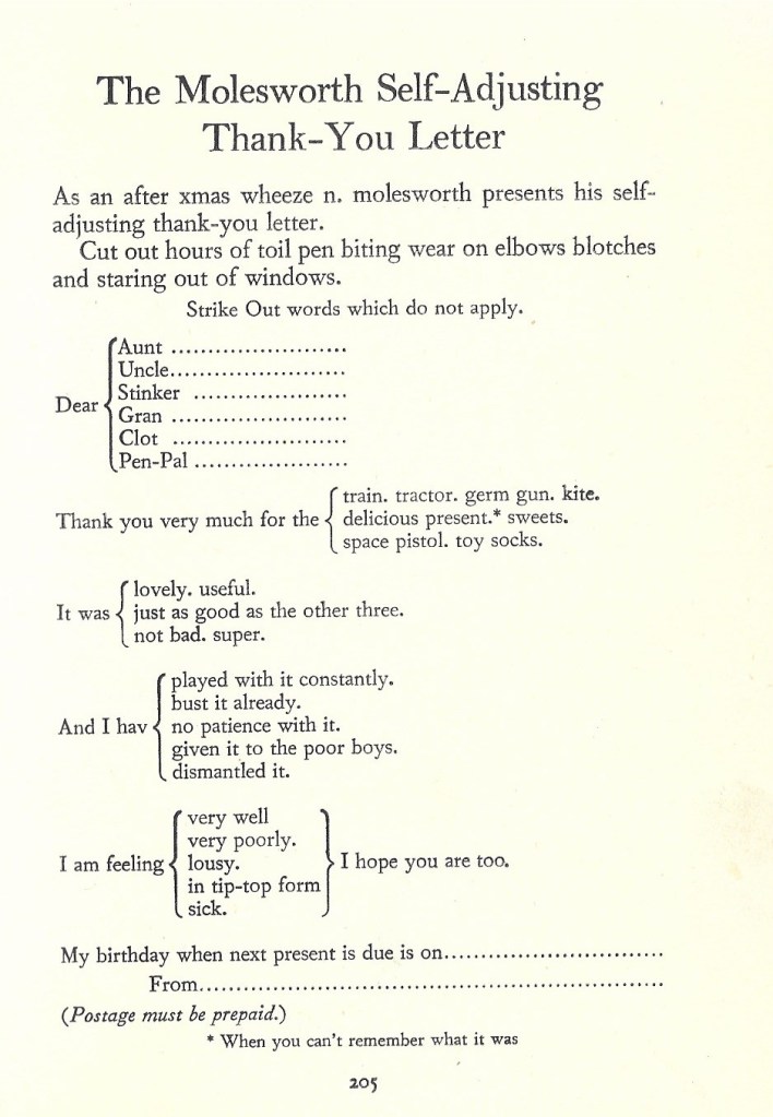 As an after xmas wheeze, n. molesworth has helpfully included an ingenious self-adjusting thank-you letter to send to any aunts, stinkers, clots or pen-pals who might’ve given you a delicious present or germ gun this year.