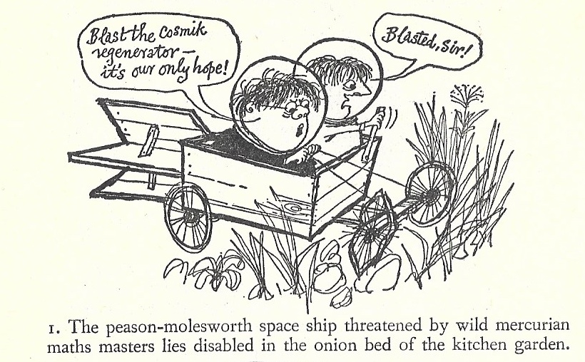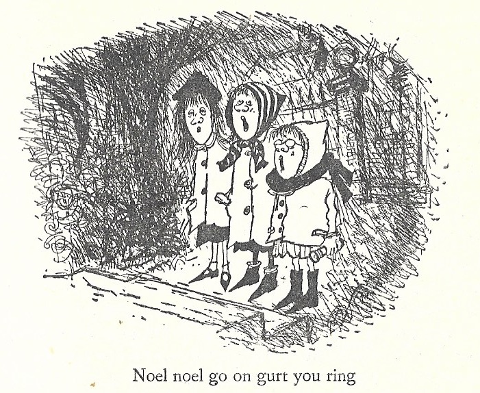 In the second book, How to be Topp (1954), Molesworth is at home for Christmas. Although there are no masters or canings to be avoided, there are still obstacles between him and his beloved space serial on the wireless. If it’s not the tuneless Wates girls warbling on the doorstep and extracting money from the intoxicated grown-ups, it’s his father insisting on reading the classic, xmas carol by c. dickens.