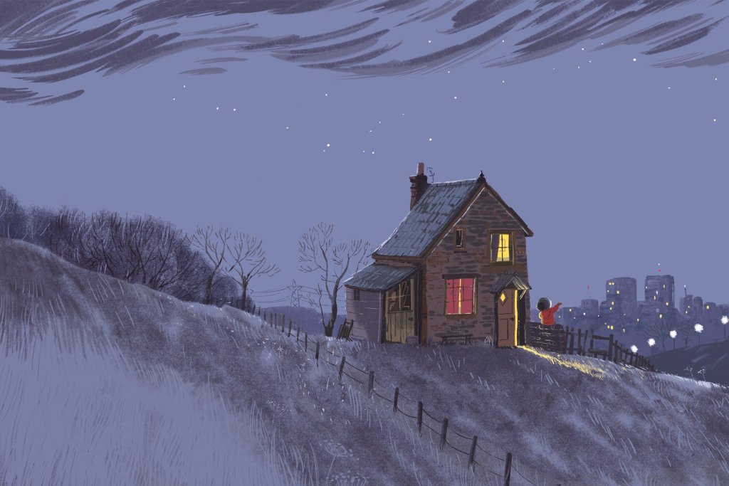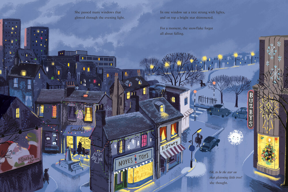 The snowflake eventually finds her way to Noelle’s every town, a place that will be familiar to any British child in 2020 – and likely readers throughout the world. This is a contemporary setting of concrete high-rises and sodium lit ring roads, urban but not too gritty.