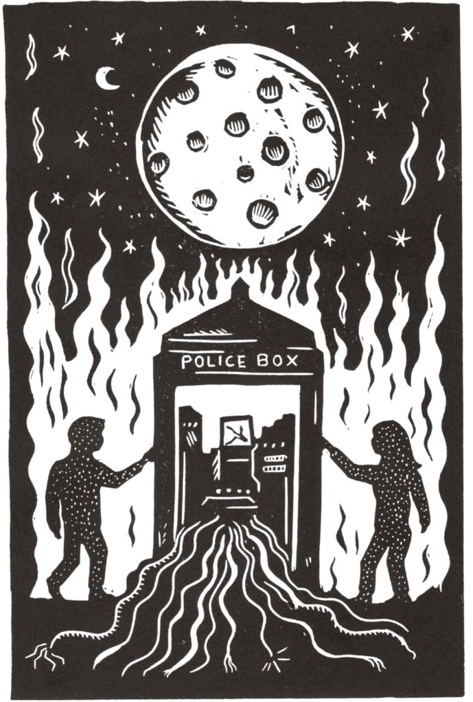 Like Rudden’s previous Doctor Who anthology, Twelve Angels Weeping, the book comes with accompanying linocuts by Alexis Snell. It’s a lovely touch, reflecting the lead character’s timelessness and refreshing well known icons from the show’s history.