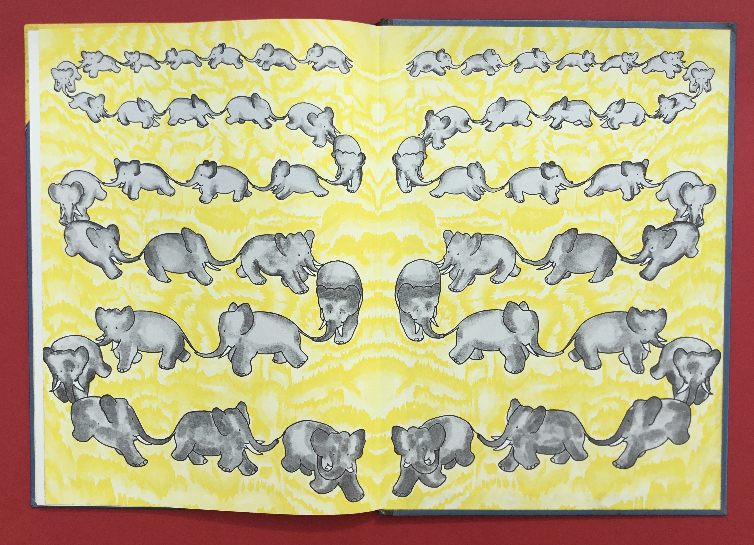 The elephants’ idyll is almost immediately broken by the arrival of a cruel hunter. Writing in her picture book history, Fierce Bad Rabbits, Claire Pollard calls this moment ‘the most upsetting image in the history of the picture book – the total grief of a child losing a parent mixed with our fear that something terrible might happen to the child.’