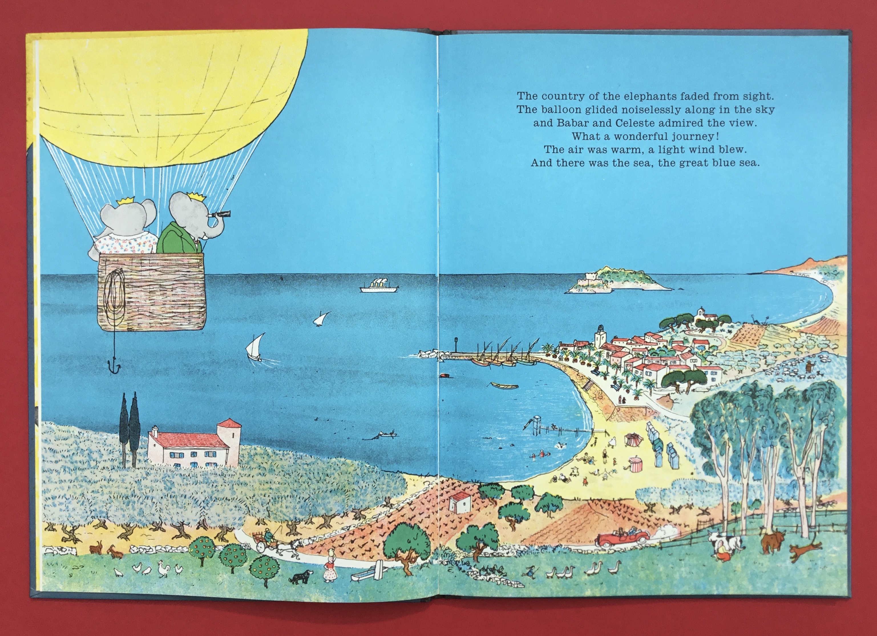 Pleasingly, the second in Jean de Brunhoff’s series, Babar’s Travels, picks up where the first book left off. After his marriage to Celeste the newlyweds take flight in their balloon and the country of the elephants fades from sight.