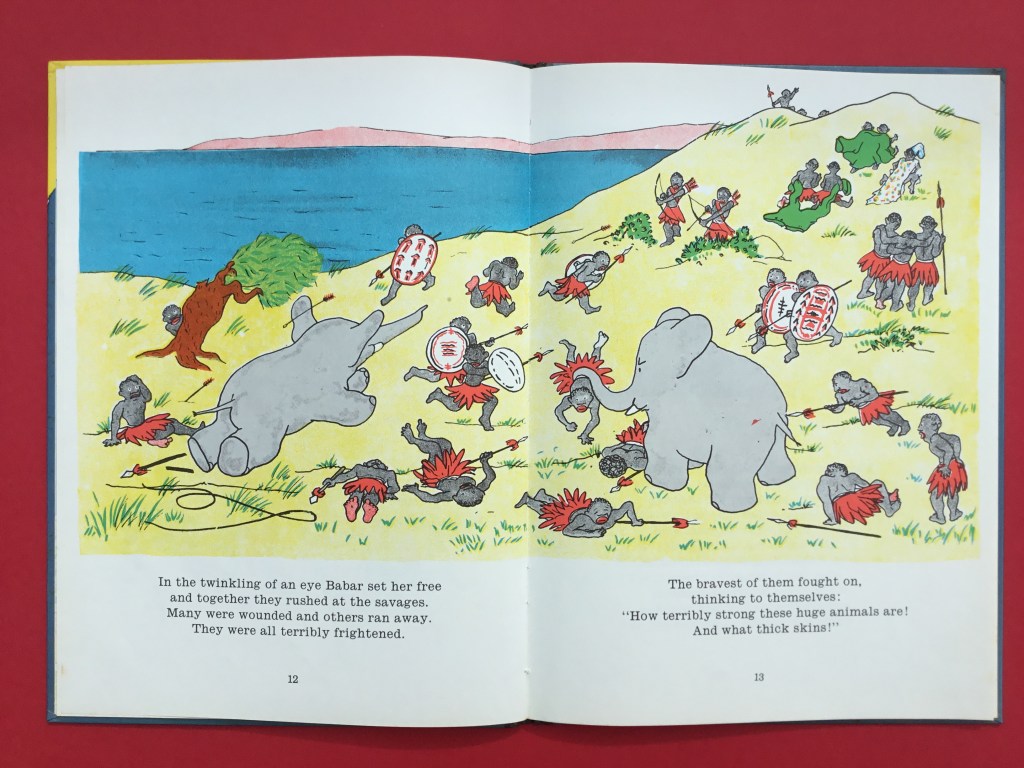 De Brunhoff shows us that his elephant society is rooted in violence and the erasure of existing cultures. Whilst not intentionally racist, these scenes make an otherwise beautiful book a deeply uncomfortable read